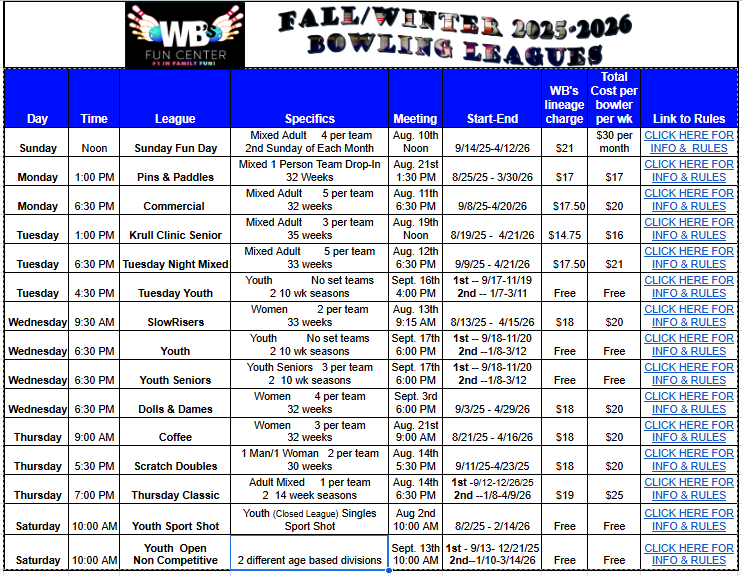 Dolls & Dames 4 women 6:30 p.m. 32 Wks 8/14/24 - 4/9/25 Wednesday Youth Leagues Free for youth bowlers 6:30 p.m. 9/18 - 11/20/24 and 1/8 - 3/12/25